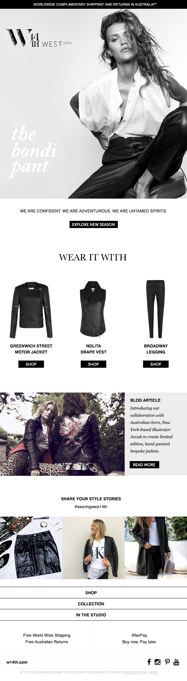 The website and online presence of West 14th is designed to exhibit the wear and function of each garment, and to inspire customers with the use of photography and studio sections. Customers are guided through the checkout process, and communicated to regularly with constant website updates and electronic newsletters.